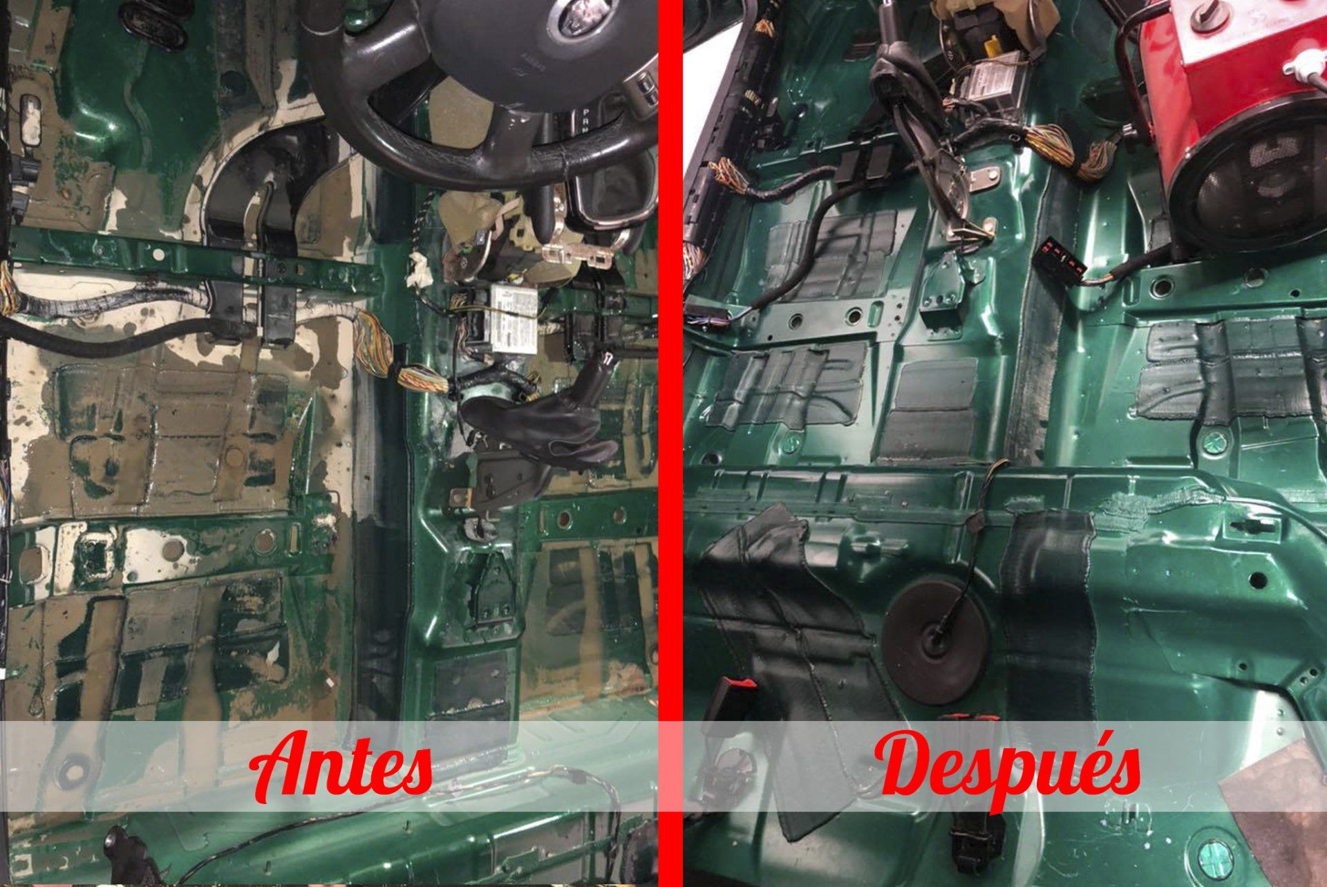 Aspiración profunda, desmonte de asientos (si hace falta), desengrasado de todos los paneles y plásticos, lavado de moqueta y alfombrillas, eliminación de manchas, lavado de asientos, limpieza de salpicadero, maletero y cristales, lavado manual exterior.